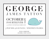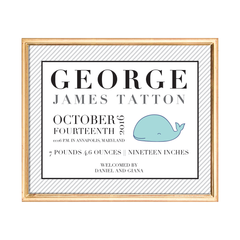 Perfect for a little sailor's nursery, this preppy and classic custom art print is personalized with baby's birth details and features a whimsical whale illustration.