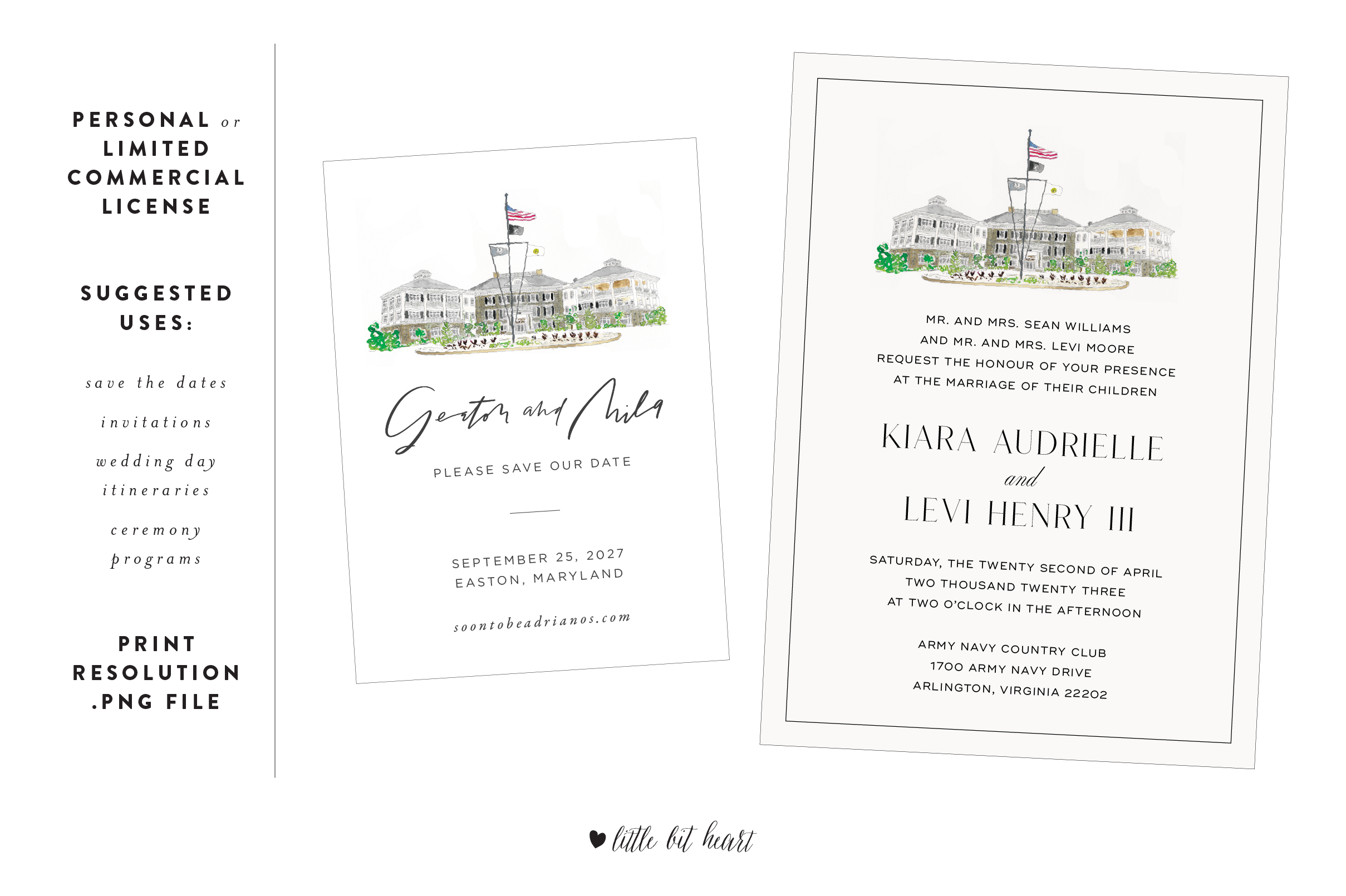 Add a bespoke touch to your wedding stationery project with this handpainted watercolor illustration of the Army Navy Country Club in Fairfax, Virginia.